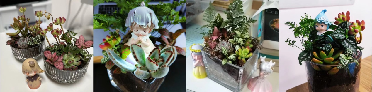 会场提供了多肉植物、绿叶植物、人物玩偶、盆栽三件套等各种材料。在专业老师的指导下,大家热情满满、跃跃欲试,尽情发挥自己的想象力和创造力,把各类植物和人偶按照自己的喜好搭配组合在一起。经过铺设水苔与泥炭土、选取植物、设计摆放、种植植物、培土和浇水等流程,完成了一盆盆错落有致的微景观构建。