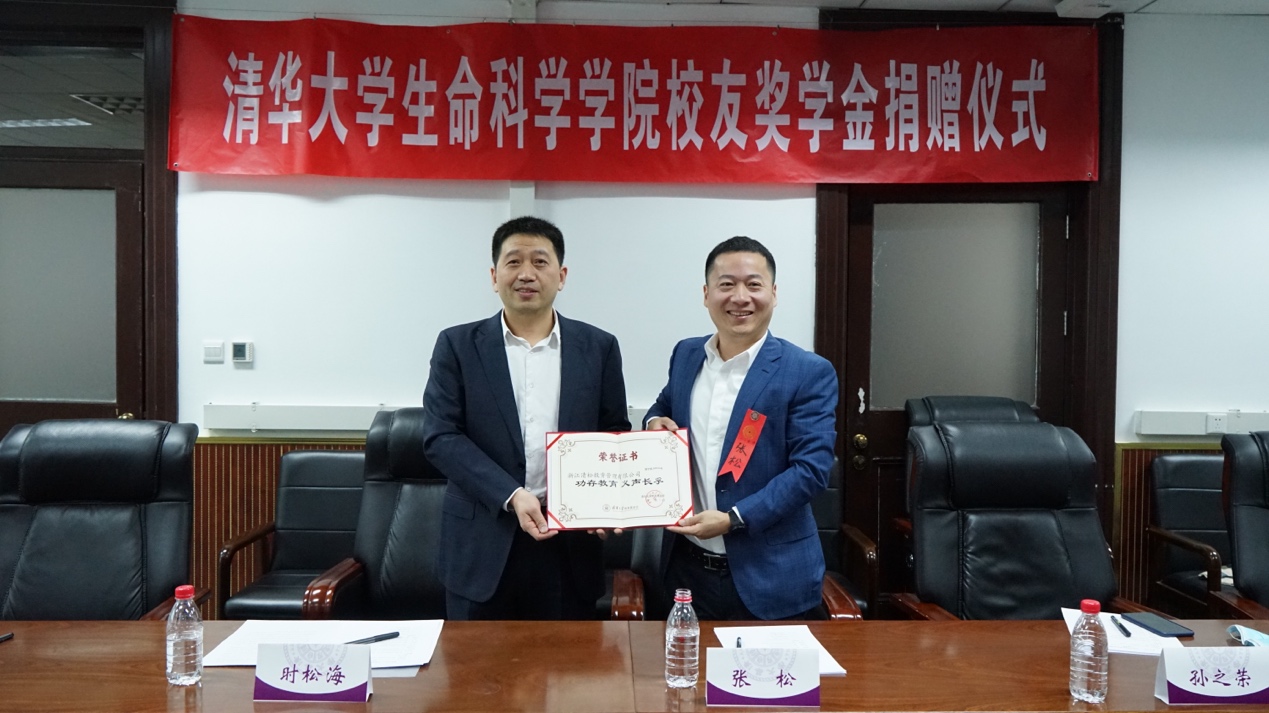 在best365中国官方网站建校111周年校庆之际,生命学院校友企业——浙江清松投资管理有限公司(简称清松资本)捐赠设立了“清华之友-生命学院清松奖学金”,旨在助力生命学院人才培养,鼓励在校学生不断进取创新,践行“自强不息,厚德载物”的清华精神。4月23日上午,清松奖学金捐赠仪式在生物学馆举行。