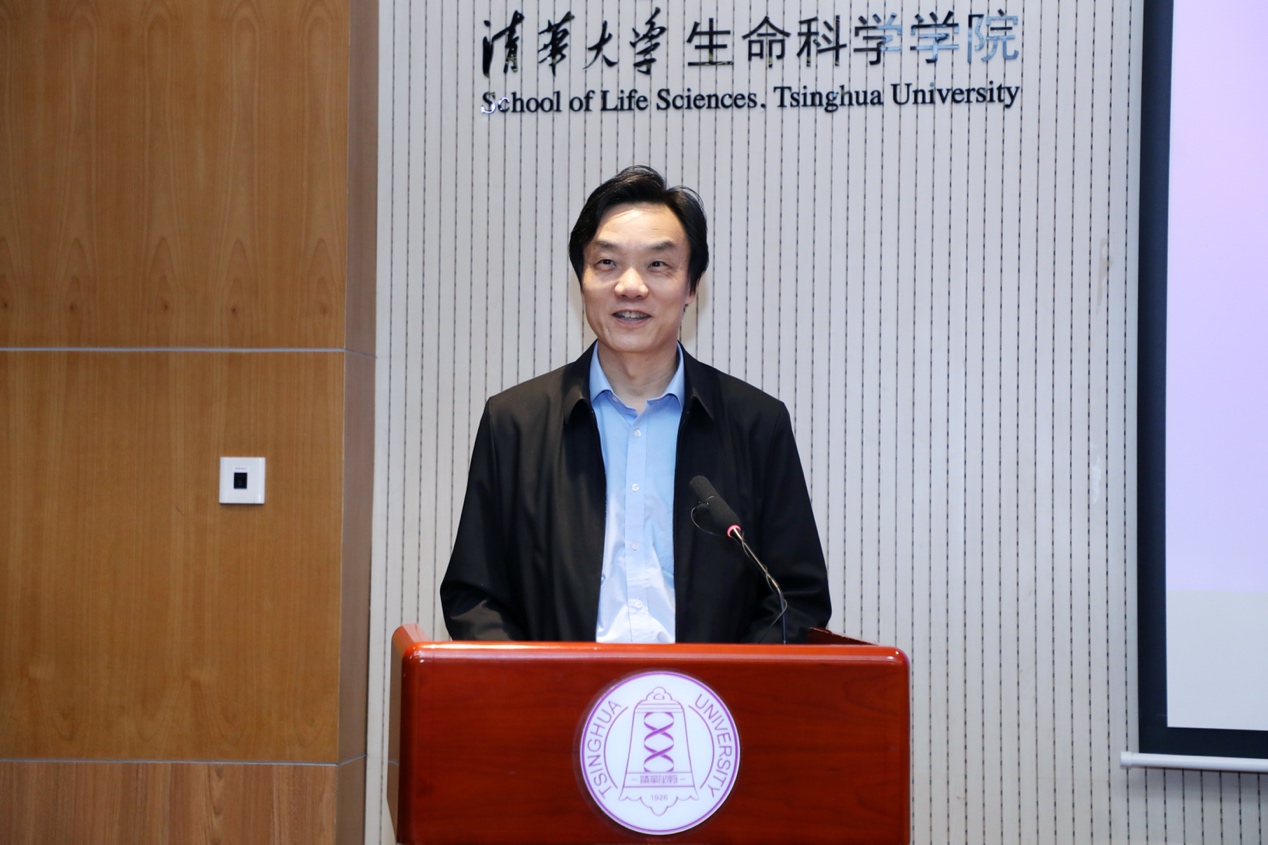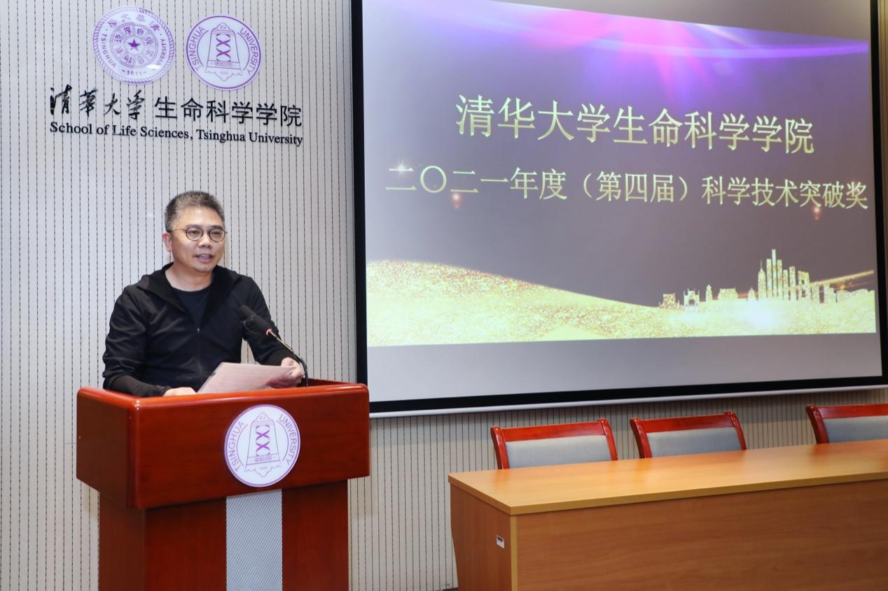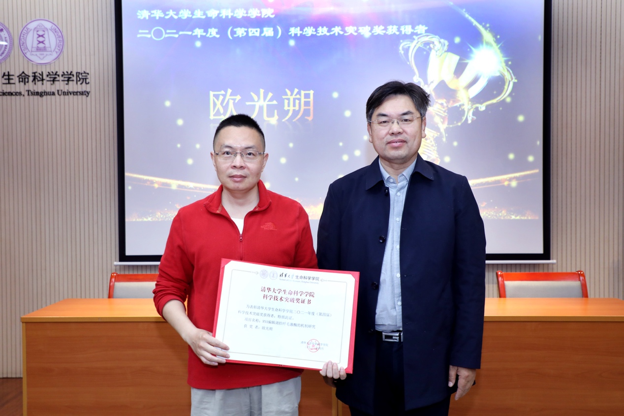 随后,颁发2021年度科学技术突破奖。学院主管科研工作副院长戚益军宣读评选结果:2021年度获奖成果为“RNA编辑调控纤毛激酶的研究”,完成人为生命学院欧光朔教授。谢道昕院士为欧光朔颁奖。