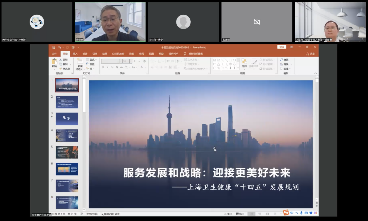 9月2日下午,best365中国官方网站研究生暑期实践支队师生与上海市卫生健康委员会的部分领导举行了线上交流会。上海市卫健委规划发展处处长徐崇勇、副处长姚丽霞和干部人事处调研员吴平、生命学院党委书记吴畏、副书记谢莉萍,副院长王新泉,研究生工作组长王佳伟,青年教师李赛,研究生事务教师董园、董超凡及40余名研究生参加了活动。