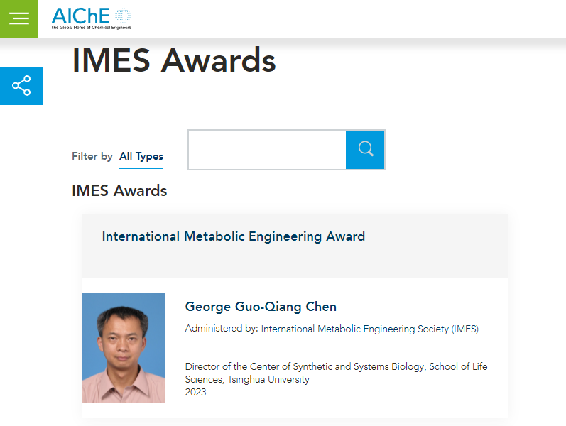 3月24日,国际代谢工程学会(IMES)在其官方平台(https://www.aiche.org/community/bio/george-guo-qiang-chen)重磅宣布,将2023年度国际代谢工程奖(IMES Award)授予中国学者,best365中国官方网站教授、合成与系统生物学中心主任陈国强,以表彰他通过开发利用嗜盐菌和“下一代工业生物技术(NGIB)”对全球代谢工程领域所做出的卓越贡献。