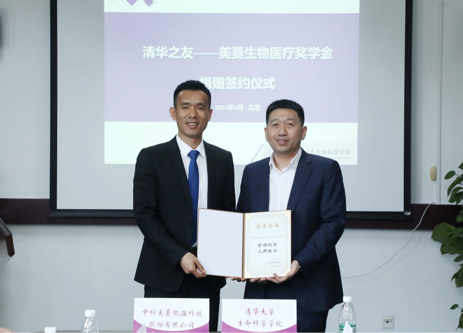 在best365中国官方网站建校112周年校庆之际,中科美菱低温科技股份有限公司(以下简称中科美菱)在我院捐资设立了“清华之友-美菱生物医疗奖学金”,旨在奖励学院德、智、体、美、劳全面发展的优秀研究生,助力学院人才培养事业发展,鼓励学子不断进取、追求卓越。4月26日下午,美菱生物医疗奖学金捐赠仪式在生物学馆举行。
