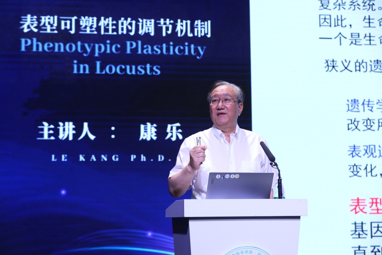 报告环节,康老师首先介绍了表型可塑性,以存在群居型和散居型的蝗虫为典型代表,并以蝗虫表型可塑性背后的调控机制为核心科学问题,用“找差异”“验功能”和“明机制”的思路剖析了多巴胺通路、型相关的气味化合物和蝗虫飞行的表型可塑性的调节,为蝗虫的监测防治提供了理论指导。康老师用幽默风趣的语言将复杂的生物学机制娓娓道来,为与会师生带来了一场颇具启发性的学术盛宴。报告结束后会场师生踊跃提问,与康老师就相关问题进行了进一步地探讨。