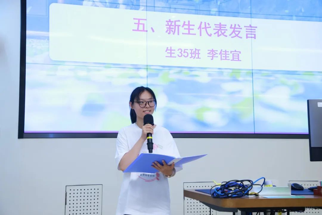 生35班的李佳宜同学作为临床医学专业新生代表发言。她分享了自己对于大学生活的认识和期待,表达了自己渴望在未来投身国家医疗事业的愿望,号召全体同学在即将开始的大学生活中保有自信、探索志趣、铭记情怀,以不懈的努力和奋斗去争取更加优异的成绩,勇担青年重任。