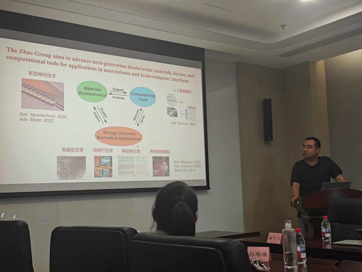 实践支队首先参观了位于医学科技楼的神经生物学相关实验室,观摩了神经科学研究的电生理设备,体验了神经生物学实验室的科研氛围。北京大学基础医学院神经生物学领域的四位青年 PI 姜红、孙琳琳、郑杰和赵思源老师依次为清华师生介绍了实验室情况,分享前沿神经技术手段的应用,双方就研究方向深入交流。