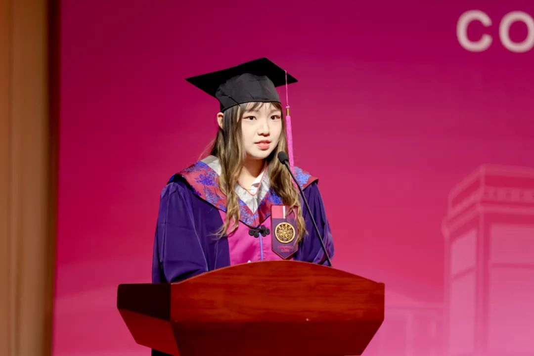 研究生毕业生代表马来西亚籍留学生谢悠扬分享了自己科研工作从“新手期”到“绽放期”的转变。他鼓励同学们无论面对何种外部困难,都要保持内心的坚守和从容。他也分享了留学期间中国科技飞速发展和科研条件完善的亲身经历,并诚挚邀请世界各地的学子来中国、来清华深造。