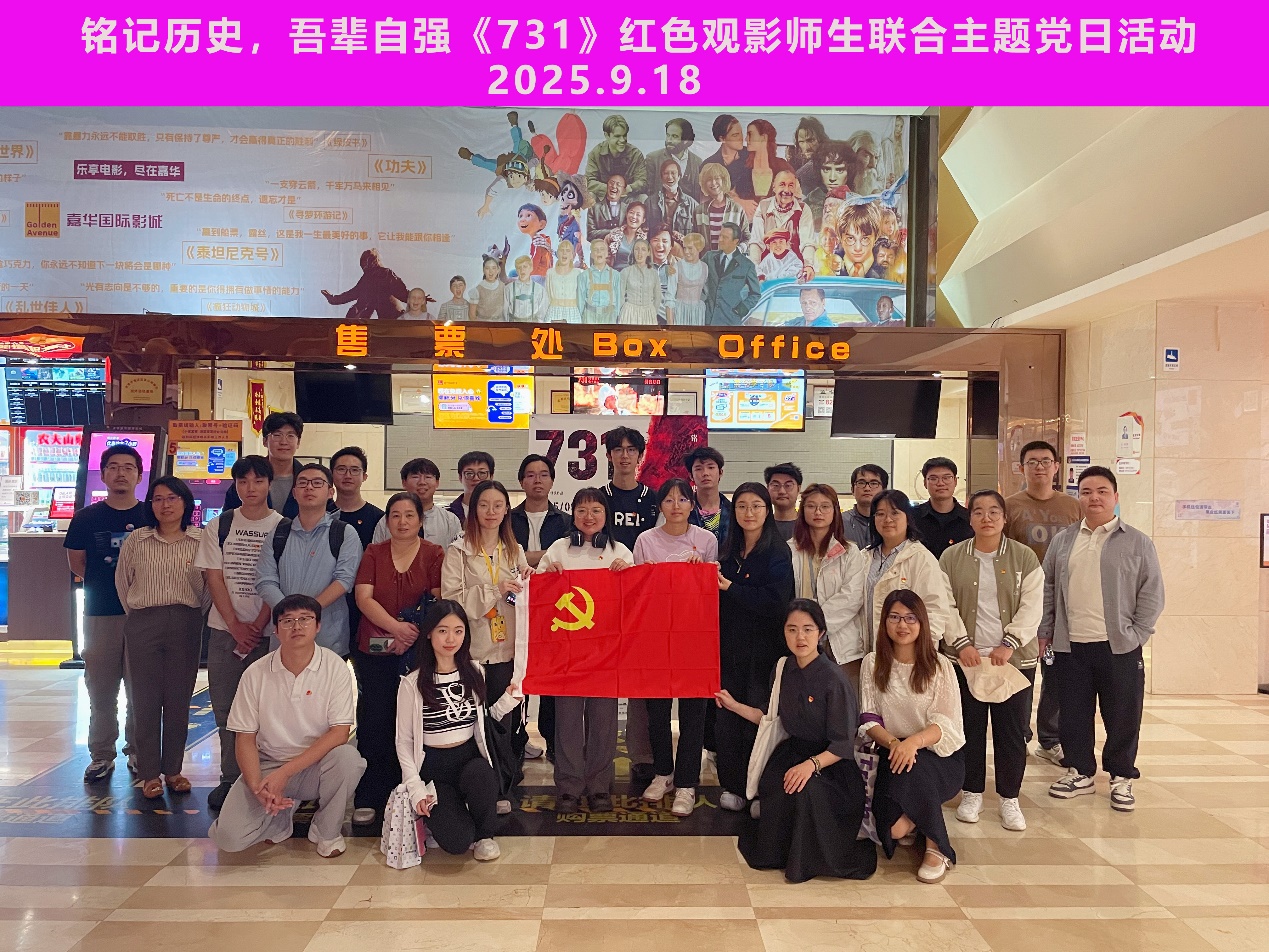 2025年9月18日下午,在“九一八”事变爆发94周年之际,为进一步增强全体师生党员的爱国情怀与历史责任感,生命学院第四党支部牵头,联合学院生博54、生博44、生博212党支部等多个党支部以“铭记历史,吾辈自强”为主题,组织教工、博士生党员以及群众开展师生联合主题党日活动,共赴嘉华国际影城(新辰里学清路店)集中观看电影《731》(北京首映),在回望历史中传承红色基因,激发责任担当,凝聚奋进力量。本次活动共计35人参加。