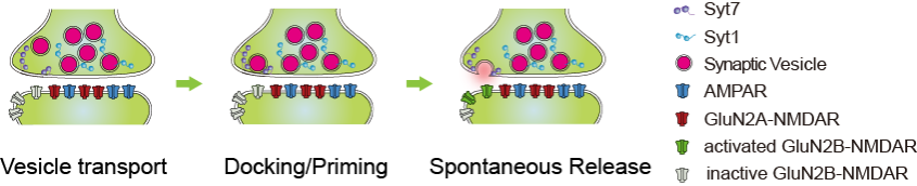 Then, the authors investigated that physiological function of Syt7-triggered spontaneous glutamate release. Based on their finding in 2020 that Syt7 deficiency induces GluN2B-NMDAR deficits that contribute to the induction of BD-like behaviors, the authors soon discovered that compared to the non-Syt7-triggered spontaneous release events, the Syt7-dependent events that occurred in the peripheral synaptic region could efficiently activate the juxtaposed postsynaptic GluN2B-NMDARs. Moreover, modifying the localization of Syt7 within the release site still allowed Syt7 to trigger spontaneous release, but the positional non-correspondence abolished the activation of the GluN2B-NMDARs. Hence, Syt7-triggered spontaneous glutamate release was involved in bipolar disorder through activating the GluN2B-NMDARs.