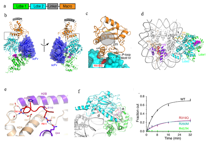 In eukaryotes, the genomic DNA is wrapped around histones to form nucleosomes, which are further assembled into chromatin. Package of the chromatin within the nucleus blocks access to the DNA. Chromatin remodelers alter the positions and compositions of nucleosomes, regulating the chromatin structure and various nuclear transactions. Tight control of the activity of remodeling enzymes ensures the proper chromatin landscape and cellular functions. ALC1, a member of the Snf2 superfamily ATPases, contains two RecA-like ATPase domains (lobe 1 and lobe 2) and a C-terminal macro domain (Fig a). ALC1 relaxes chromatin and plays an important role in the poly (ADP-ribose) polymerase 1 (PARP1)-mediated DNA repair pathway. Upon DNA damage, PARP1 is activated and catalyzes the synthesis of poly (ADP-ribose) (PAR) chains on itself and on many other proteins. The PAR chains bind to the macro domain of ALC1, releasing the autoinhibition of ALC1 and targeting the remodeler to the sites of DNA damage, where ALC1 slides the nucleosome and opens the chromatin.