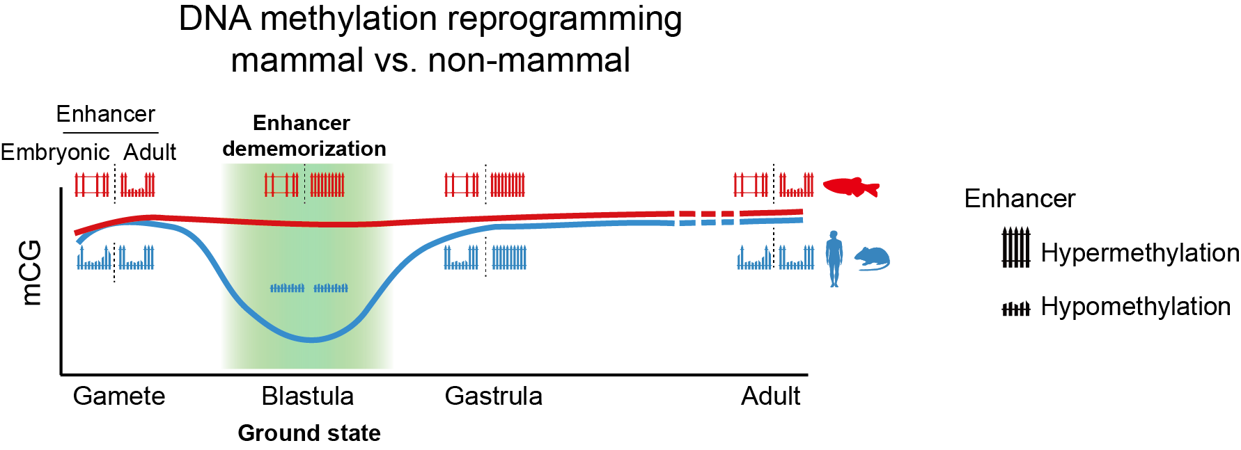 While the majority of CpG dinucleotides in vertebrate genome are hypermethylated, regulatory elements, such as enhancers and promoters, are preferentially hypomethylated. Drastic DNA methylation reprogramming after fertilization occurs to convert two terminally differentiated gametes to a totipotent embryo in mammals. However, non-mammalian vertebrates, such as zebrafish and Xenopus, inherit the global DNA methylome from gametes to early embryos. It remains puzzling why post-fertilization global DNA reprogramming occurs only in mammals but not in non-mammalian vertebrates. Despite the persisting global DNA methylation in zebrafish early embryos, previous work from Wei Xie’s group and Anming Meng’s group revealed marked local DNA methylation reprogramming at enhancers during parental-to-zygotic transition in zebrafish. Specifically, enhancers become fully methylated (thus “dememorized”), either prior to fertilization for sperm, or just after fertilization for oocyte, in zebrafish early development. Despite these intriguing findings, the function of such enhancer dememorization and how embryonic enhancers operate in a such unusually hypermethylated genome remain enigmatic.