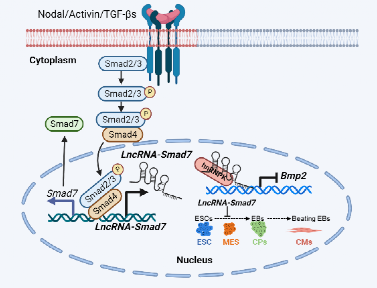 The heart is one of the earliest differentiating organs, and heart development requires stepwise regulation dependent on the precise control of genetic networks, in which Nodal/TGF-β and BMP signaling regulates cardiomyocyte commitment Numerous lncRNAs are broadly expressed during early heart development, and these early development and tissue homeostasis lncRNAs are also known to be induced by the TGF-β family. However, whether and how lncRNAs participate in cross-talk between TGF-β and BMP signaling branches has not been documented.
