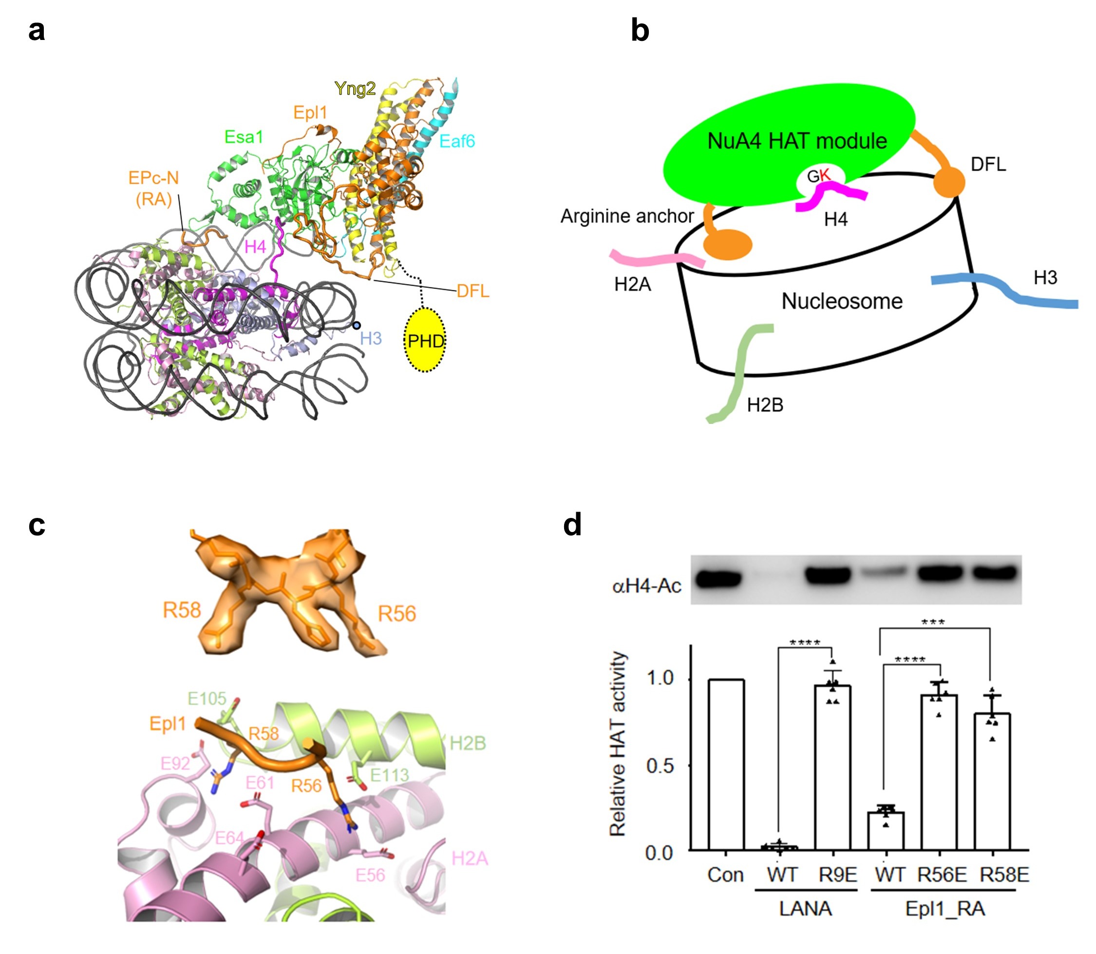 (a) Structure of the HAT module bound to the nucleosome. RA, arginine anchor. (b) Model of the position-based mechanism of the HAT module for H4 recognition. (c) Local EM density of the arginine anchors, and the interaction with the H2A-H2B acidic patch. (d) Relative HAT activity of NuA4 to the H4 of the nucleosome in the absence and presence of the LANA and arginine anchor peptides.