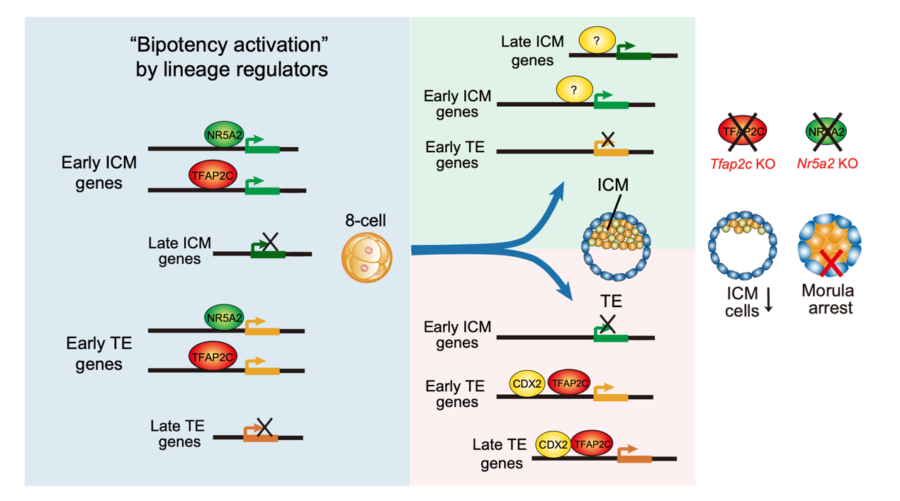 TFAP2C and NR5A2, which are generally thought to be TE and pluripotency regulators, respectively, are both highly expressed at the 8-cell stage. The researchers first investigated the chromatin targets of TFAP2C via CUT&RUN during the early mouse lineage specification across 6 stages, spanning the initiation, commitment, and maintenance phases. Moreover, they also generated Tfap2c knockout embryos to dissect its functions. Unexpectedly, at the initiation stage, TFAP2C bound and activated both early TE and ICM genes at the bipotent stages, rather than specifically activating the TE fate program. These results indicate lineage TFs do not prime cell fate programs, instead function as “bipotency activators”.