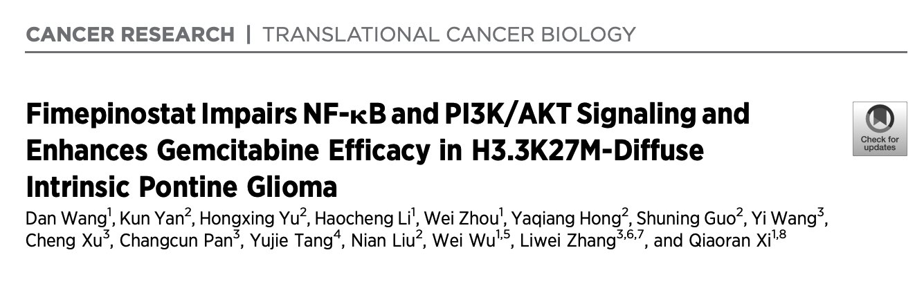 On February 15, 2024, Qiaoran Xi’s research group from Tsinghua University and Liwei Zhang’s research group from Beijing Tiantan Hospital, Capital Medical University published an article in Cancer Research entitled “Fimepinostat impairs NFκB and PI3K/AKT signaling and enhances gemcitabine efficacy in H3.3K27M-diffuse intrinsic pontine glioma”.