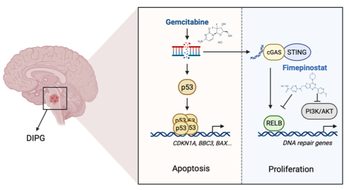 In this study, they used treatment-naïve patient-derived DIPG cell line provided by Tiantan hospital, and performed epigenetic compounds screening to identify that gemcitabine as a candidate. As a pyrimidine analog, gemcitabine stabilized and activated p53, including increasing chromatin accessibility for p53 at apoptosis-related loci. Notably, the H3.3K27M mutation facilitates gemcitabine-induced apoptosis in DIPG. However, gemcitabine induced the transcription of ERV (endogenous retrovirus), which might activate cGAS-STING signaling, and stimulated non-canonical NFκB signaling. A drug screen in gemcitabine-treated DIPG cells revealed that fimepinostat, a dual inhibitor of HDAC and PI3K, effectively suppressed the gemcitabine-induced NFκB signaling in addition to blocking PI3K/AKT activation. Combination therapy comprising gemcitabine and fimepinostat elicited synergistic anti-tumor effects in vitro and in orthotopic H3.3K27M DIPG xenograft models.