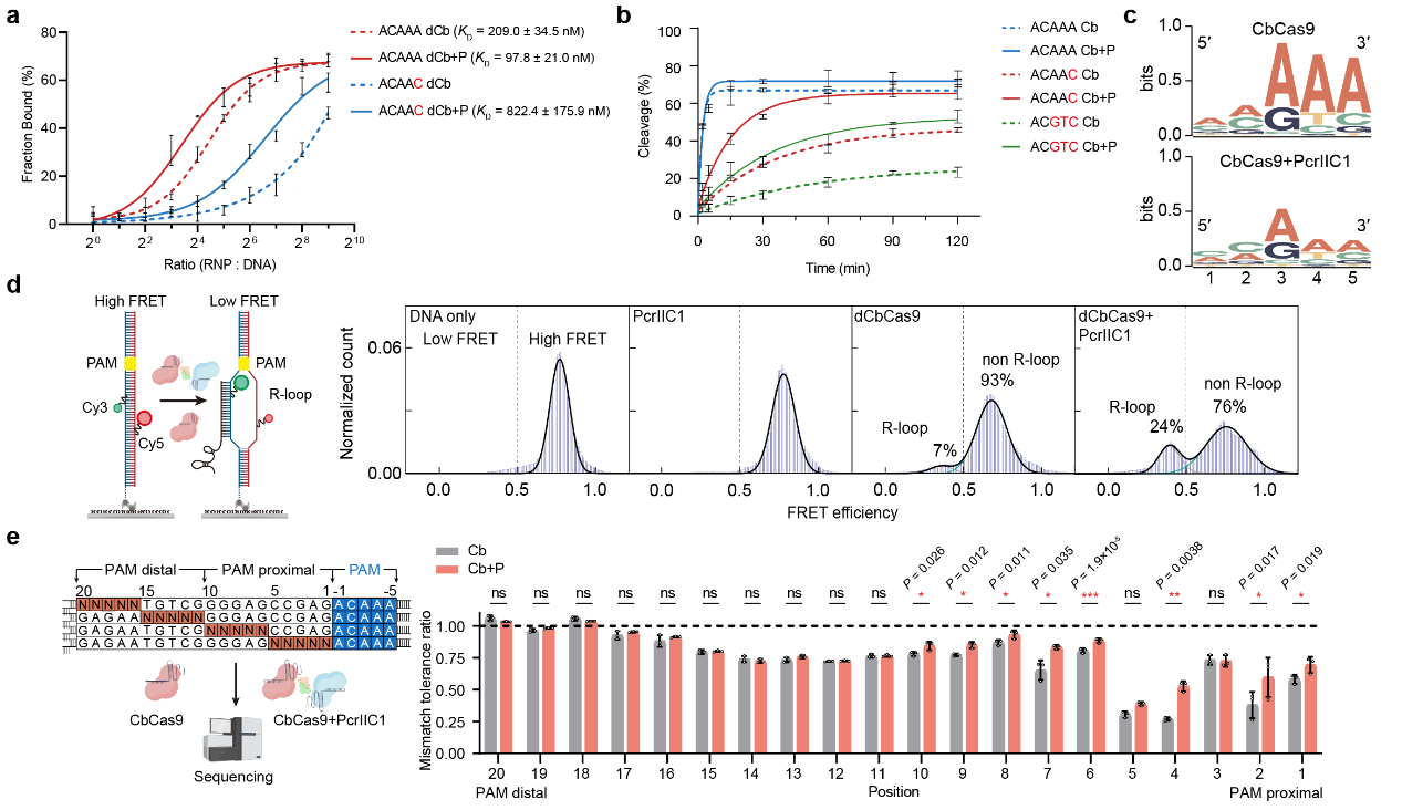 PcrIIC1 enhances CbCas9's DNA-binding (a), cleavage (b), PAM compatibility (c), DNA unwinding (d), and mismatch tolerance (e)