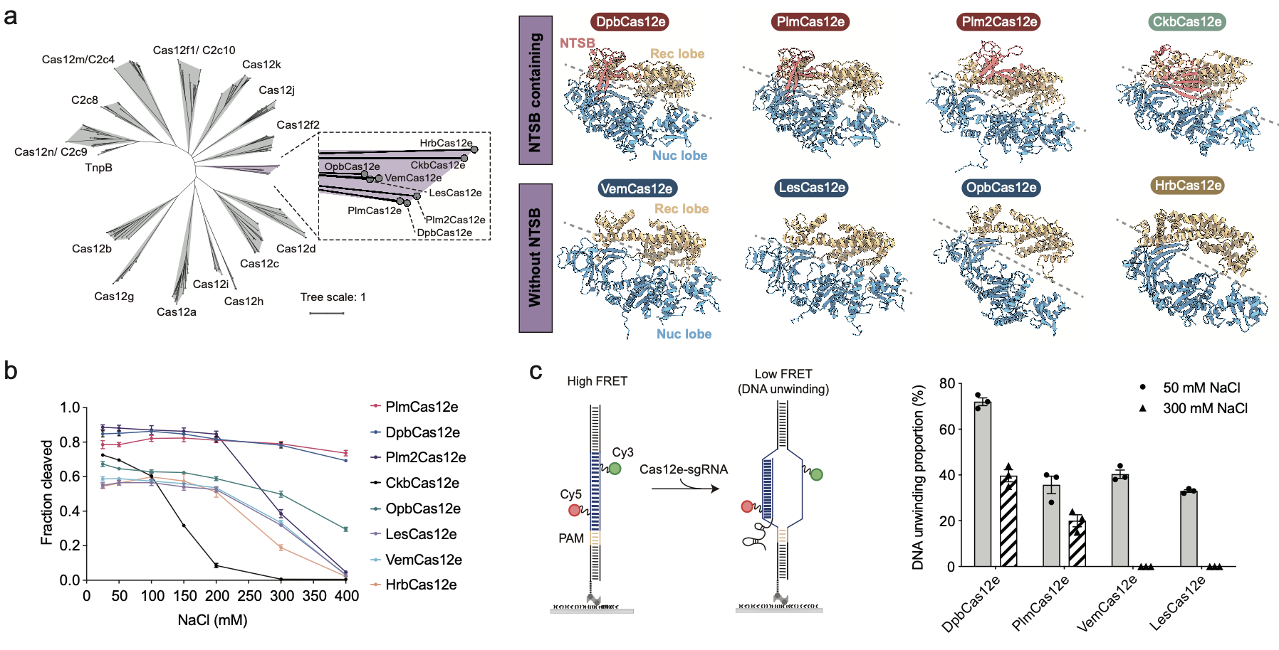 Using bioinformatics, the team identified six new Cas12e orthologs, ranging from 818 to 920 amino acids in size. Structural predictions revealed significant variations in the non-target-strand binding (NTSB) domains across these proteins (Figure 1). Biochemical assays confirmed that Cas12e proteins preferentially recognize T- or C-rich PAM sequences, demonstrating diverse DNA interference abilities. The researchers found that the cleavage efficiency of Cas12e orthologs is closely related to salt concentrations. Using single-molecule FRET experiments, the study further demonstrated that Cas12e orthologs exhibited higher R-loop formation and cleavage activity under low salt conditions, while high salt concentrations significantly inhibited their activity. This result reveals the regulatory role of salt concentration on Cas12e function and provides insights for optimizing their efficacy in complex environments.