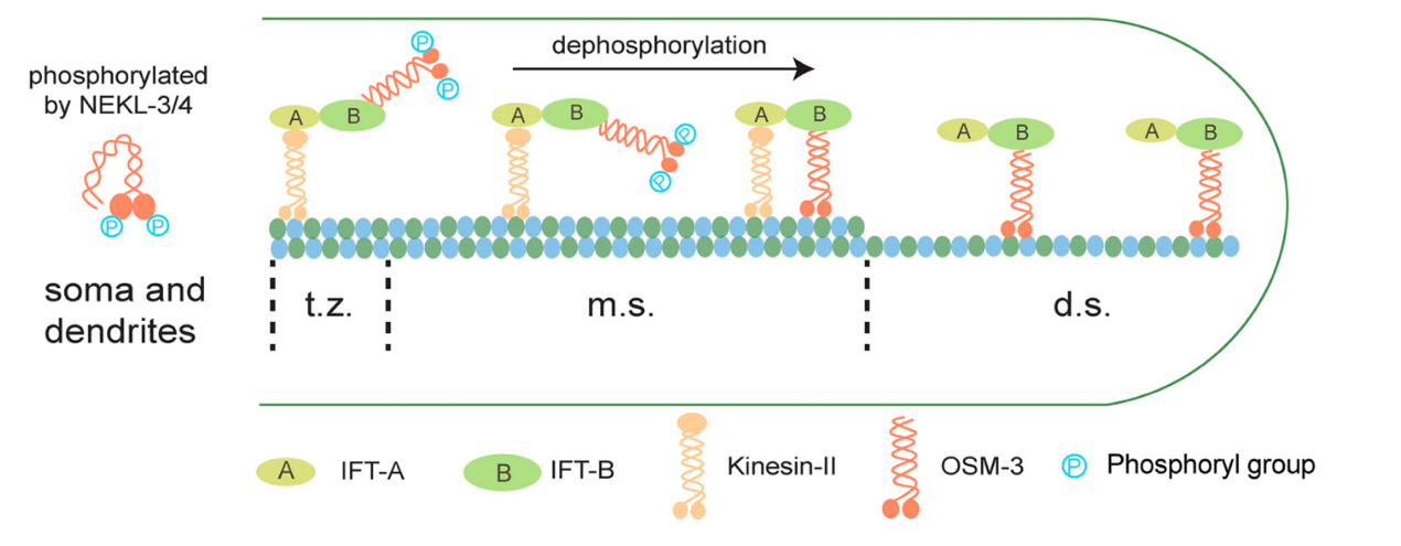 Figure 1. Diagram of proposed model on how phosphorylation regulates regional motility of ciliary kinesin OSM-3 (t.z.: transition zone; m.s.: middle segment; d.s.: distal segment).
