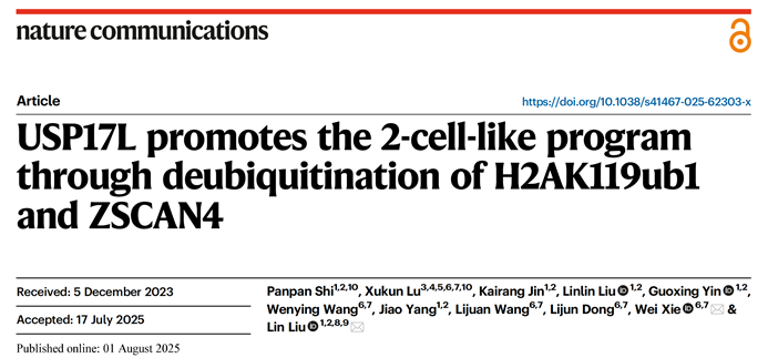 A joint team led by Prof. Wei Xie from the School of Life Sciences at Tsinghua University and Prof. Lin Liu from the School of Life Sciences at Nankai University uncovered a novel mechanism by which Usp17l, a gene family activated during minor zygotic genome activation (ZGA), regulates the 2-cell-like program at both the transcriptional and post-translational levels. Their study, titled "USP17L promotes the 2-cell-like program through deubiquitination of H2AK119ub1 and ZSCAN4", was published in Nature Communications on August 1, 2025. This work provides new insights into ZGA, the 2-cell program, and totipotency.
